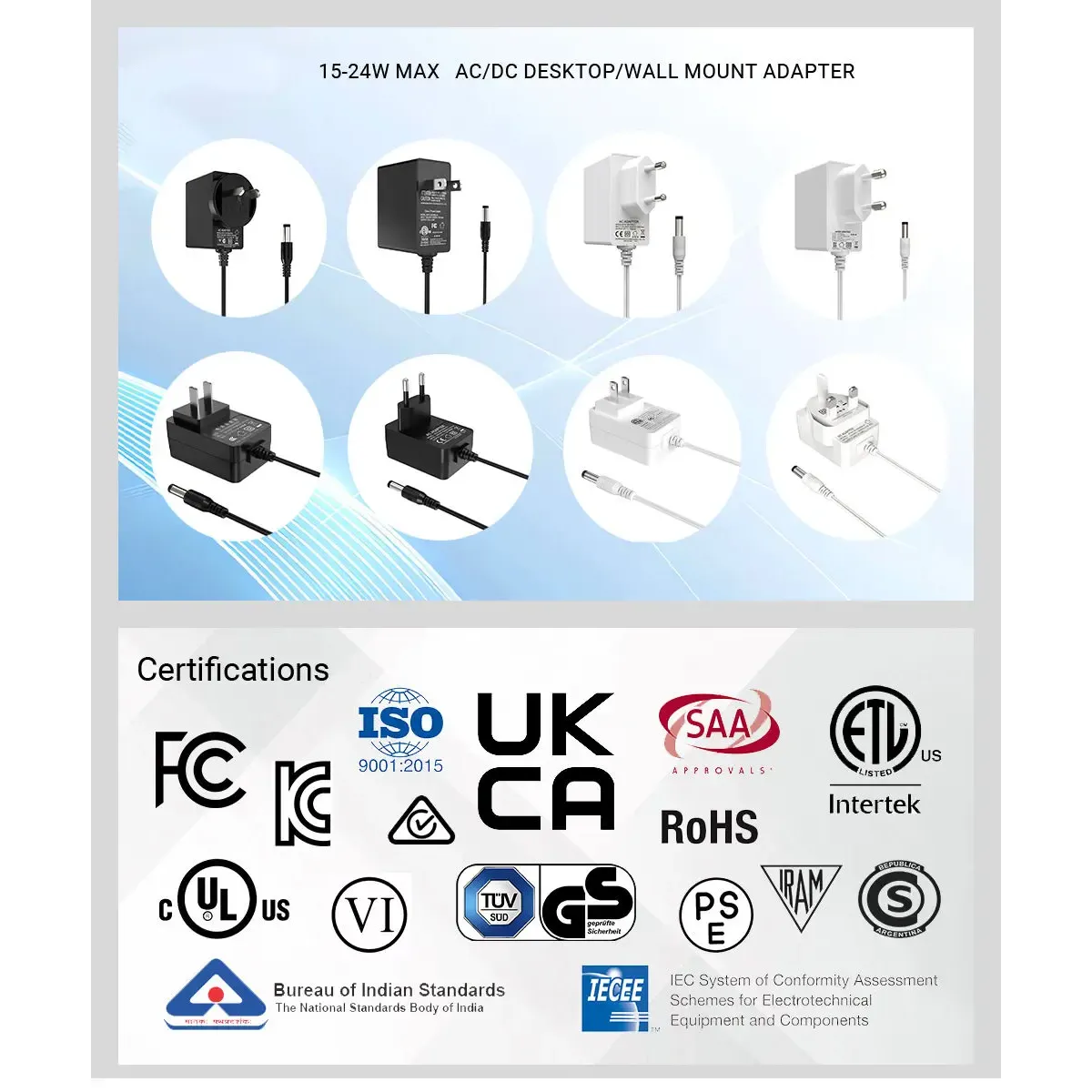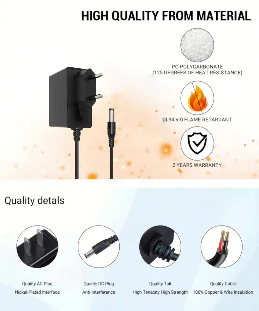 De serie voedingsadapters van 24 W voldoet aan strenge internationale normen en beschikt over wereldwijde certificeringen, waaronder het CE/FCC/UL/RCM/SAA/UKCE/KC/BIS/PSE-certificaat, waardoor de veiligheid en naleving van de milieuvoorschriften worden gegarandeerd. Het Europese stekkerontwerp zorgt voor veilige verbindingen, waardoor het gemakkelijk te gebruiken is in verschillende omgevingen.