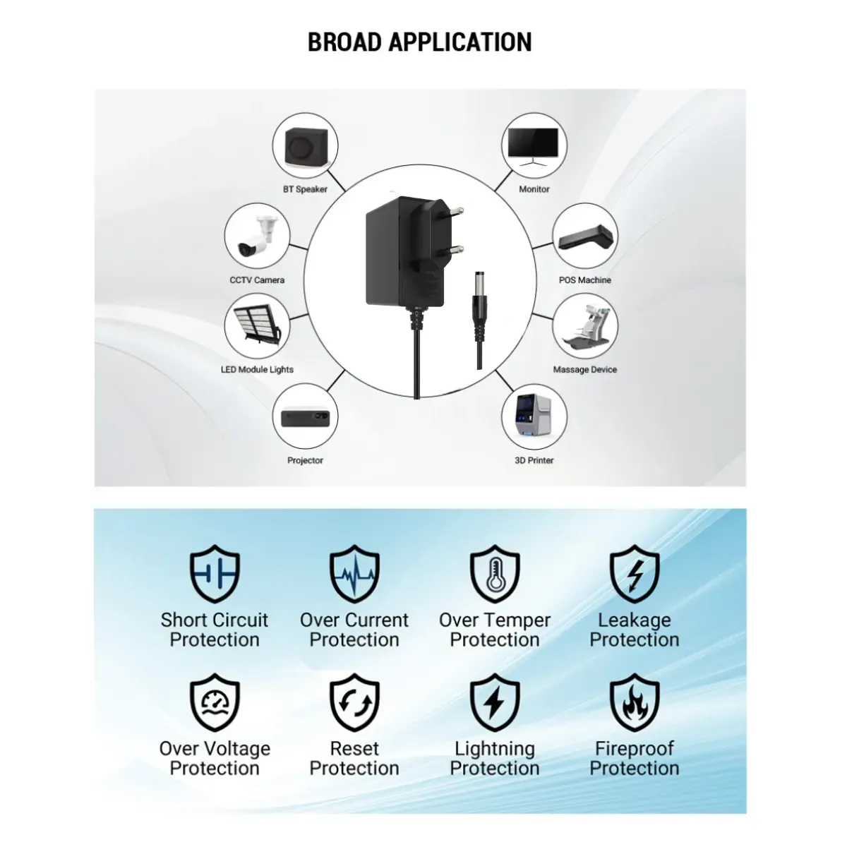 1. Uitgebreide veiligheidsgarantie: Uitgerust met meerdere beveiligingen, waaronder bescherming tegen overstroom, overspanning, kortsluiting en overtemperatuur, beschermt deze adapter zowel zichzelf als uw aangesloten apparatuur tegen elektrische storingen.
