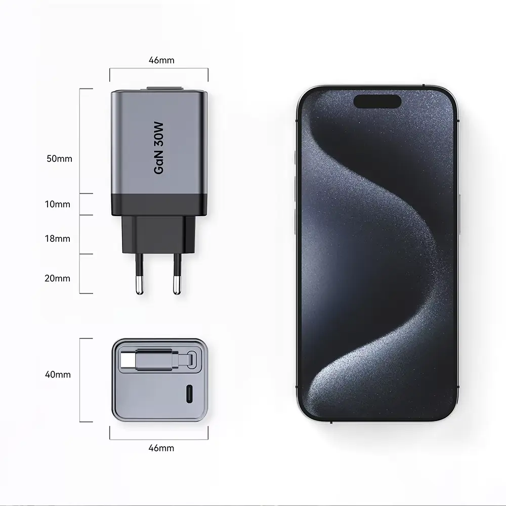 30 W snellader met intrekbare type C-kabel Dankzij het ultralichte ontwerp in zakformaat is hij gemakkelijk mee te nemen. Het is de perfecte keuze voor thuis, op kantoor of op reis.