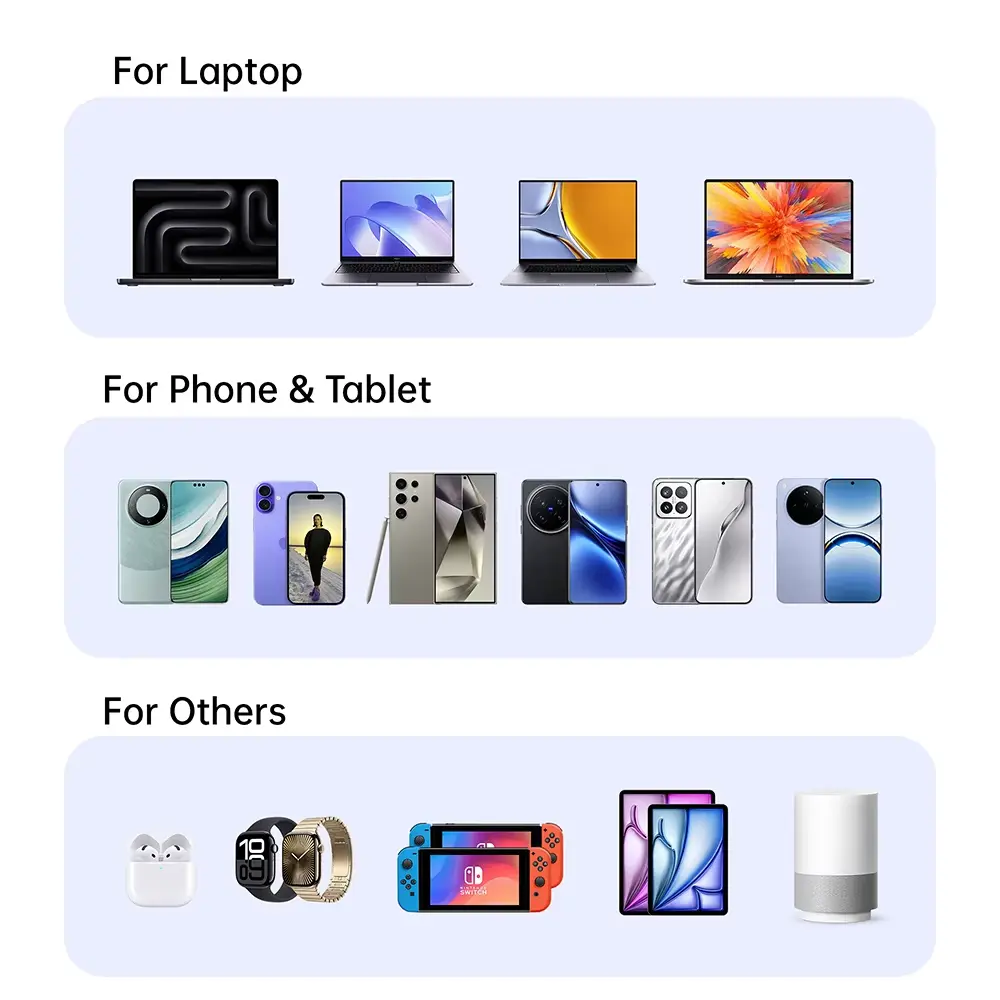 Compatibel met USB-C-apparaten, waaronder mobiele telefoons, hoofdtelefoons en gamingaccessoires. Detecteert automatisch de apparaatbehoeften voor veilig en efficiënt opladen. 4. Reisklare draagbaarheid