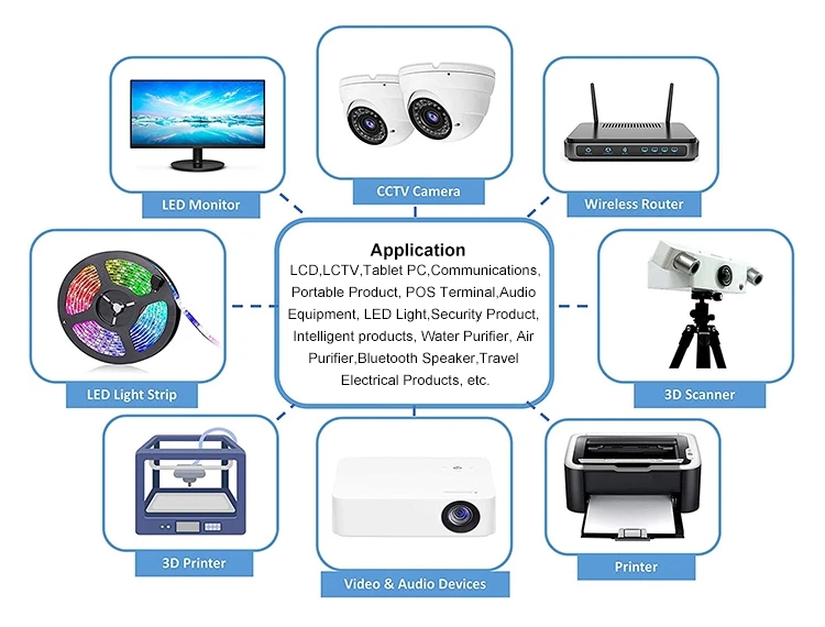 * Meer eenheden voor 48W-serie: 5V/9V/12V/15V/19V/24V/36V/48V beschikbaar * Veiligheid: OCP/OVP/OTP, SCP, automatische overbelastingsuitschakeling, overspanningsuitschakeling, automatische thermische uitschakeling. * Brede compatibiliteit: LED-stripverlichting, 3D-printer, hamradio-transceiver, CCTV-camera's, auto-subwooferversterker, audioversterker, draadloze router, ADSL Cats, luchtbevochtiger, HUB, toetsenbord, BT-luidspreker, monitor, webcam, DVR, NVR, audio-/videovoeding