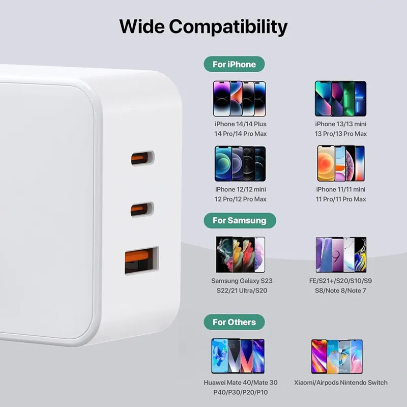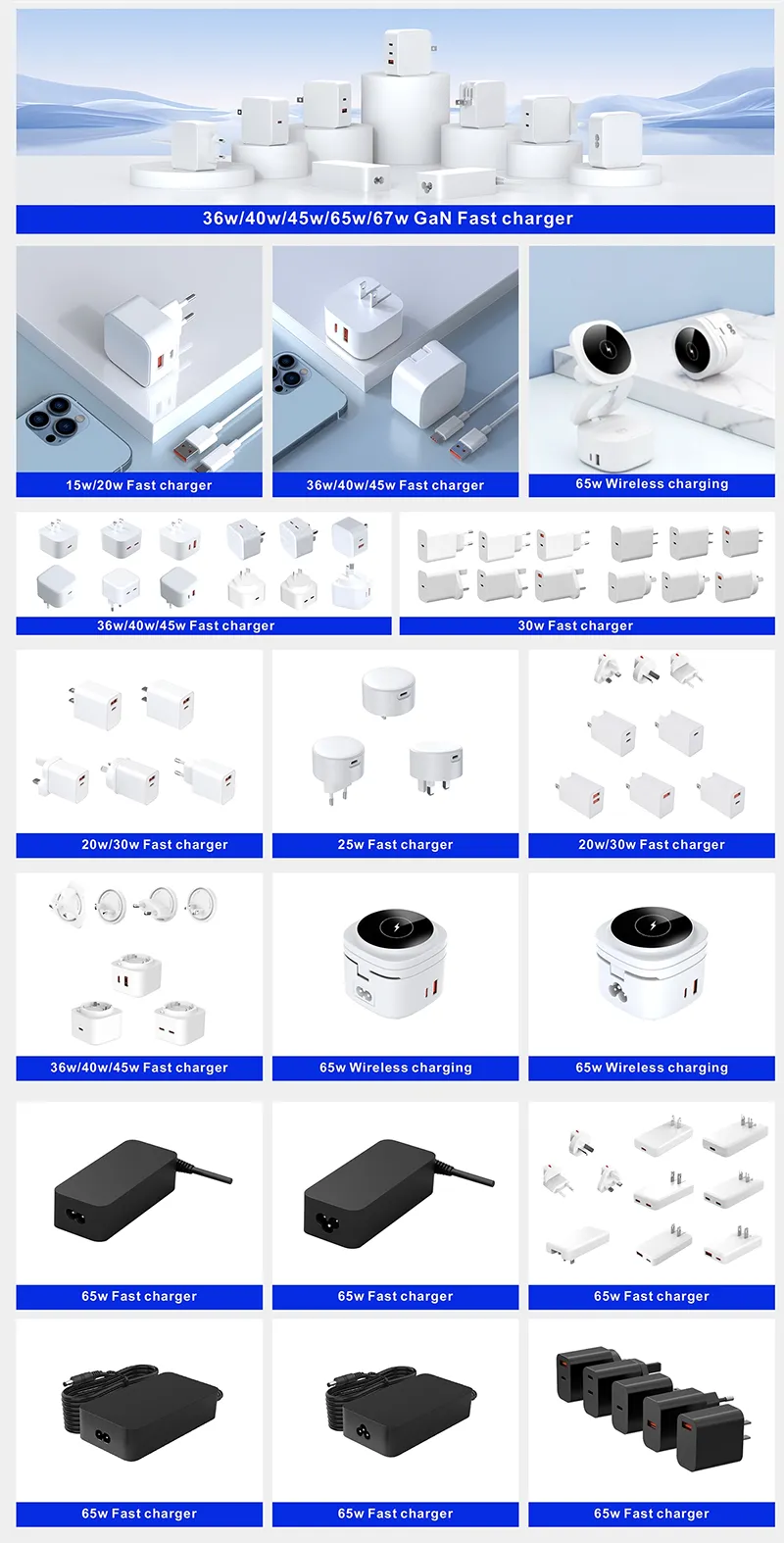 Deze oplader levert tot 65 W consistent vermogen en laadt efficiënt laptops (bijv. MacBook Air/Pro, Dell XPS), tablets, smartphones (iPhone, Samsung Galaxy) en andere apparaten op die het PD-protocol ondersteunen. Het compacte en lichtgewicht ontwerp maakt hem ideaal voor op reis, terwijl de ingebouwde overspannings-, overstroom- en kortsluitbeveiliging zorgt voor veilig opladen van de oplader en aangesloten apparaten. Het is meestal uitgerust met 1-2 USB-C-interfaces, die het tegelijkertijd opladen van meerdere kleine apparaten ondersteunen, waardoor kracht en gemak in evenwicht worden gebracht.