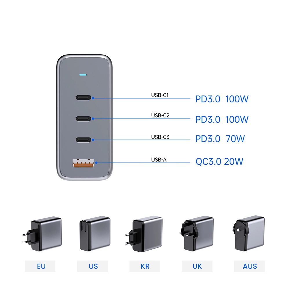 GAN 100W snellader voor laptop CE Laad meerdere apparaten snel tegelijk op om uw werkruimte netjes en georganiseerd te houden. De duurzame GaN 100W-snellader van Starwell is uitgerust met drie USB-C-poorten en één USB-A-poort, waardoor hij maximaal vier apparaten tegelijk kan voeden. Of het nu voor zakelijk of thuisgebruik is, hij kan taken met gemak aan. Van je laptop, mobiele telefoon, tablet tot smartwatch, alles kan samen volledig worden opgeladen, waardoor er uiteindelijk een einde komt aan het tijdperk van stopcontactbezetting. Dit brengt eenvoud en hoge efficiëntie op uw bureau.