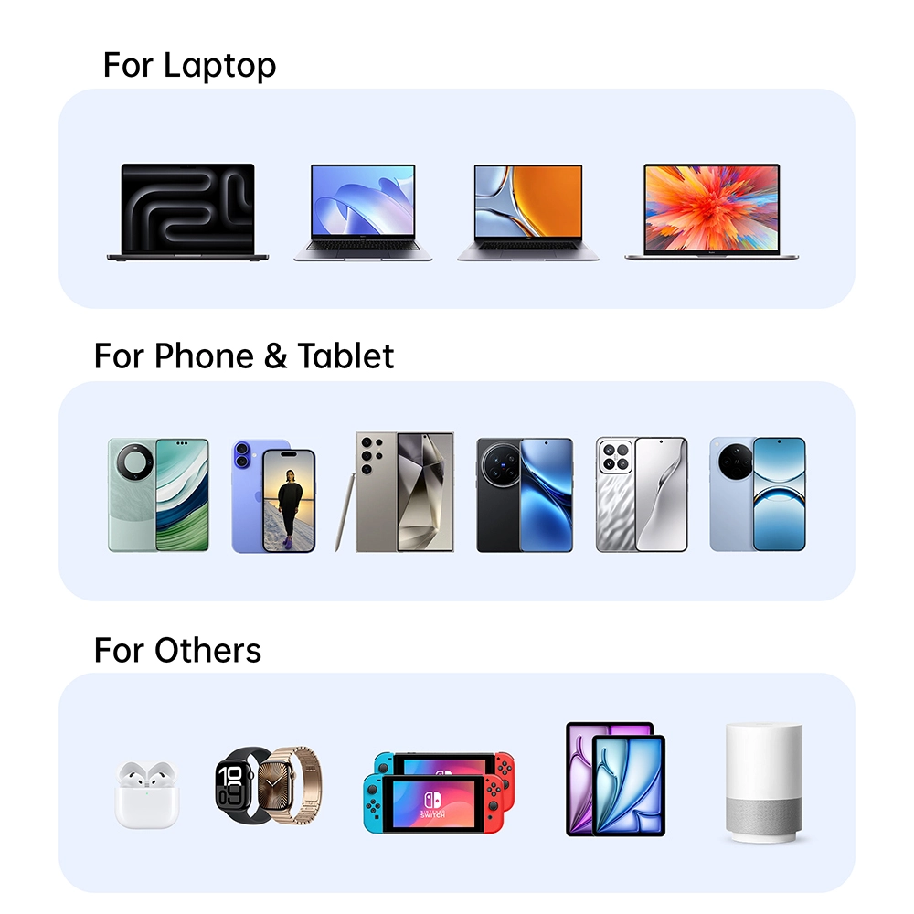 100W krachtig vermogen: het energiestation van uw laptop In de kern ondersteunen de USB-C1- en C2-poorten elk piekvermogens tot 100 W. Deze krachtige transmissiecapaciteit is voldoende om te voldoen aan de snellaadvereisten van de meeste laptops. Of u nu een MacBook Pro of andere krachtige ultrabooks gebruikt, de oplaadprestaties kunnen vergelijkbaar zijn met die van de originele opladers, of zelfs sneller. Blijf energiek, concentreer u op creatie en productiviteit, en maak u geen zorgen over de levensduur van de batterij wanneer u het apparaat gebruikt.